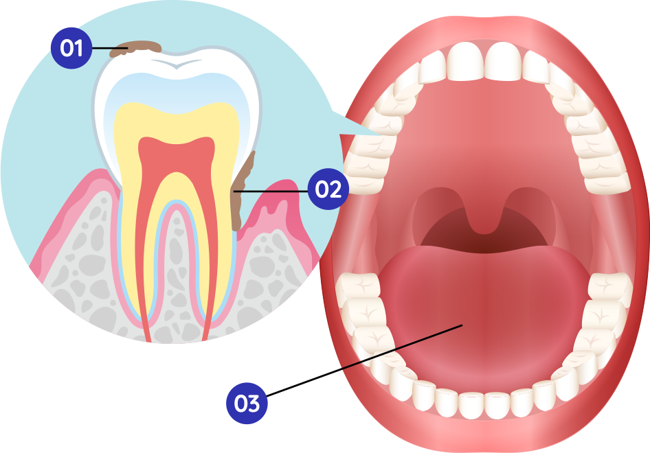 歯は、口の中に露出している部分である歯冠、歯冠より下の部分である歯根からできており、歯槽骨、歯肉、歯根膜の支持組織によって支えられています。口腔内に細菌が繁殖すると、歯や歯茎に影響を及ぼし、歯の疾患につながります。歯、歯茎、歯周組織のコンディションを清潔に保ち、疾患予防を行うことが大切です。